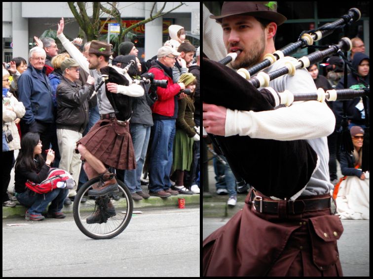 А еще в Канаде многолетний бой с дискриминацией во всех проявлениях. Особенно почему-то переживают за женщин и латиносов (выходцев из Южной Америки). Поэтому в колонне нашись пара-тройка женских обществ (на фото попало только общество Terminal City Rollergirl) и несколько девушек в костюмах, подходящих для бразильского карнавала. Сюда же добавила неясно откуда взявшихся китайцев.Наверное, просто догуливали свой китайский Новый Год.